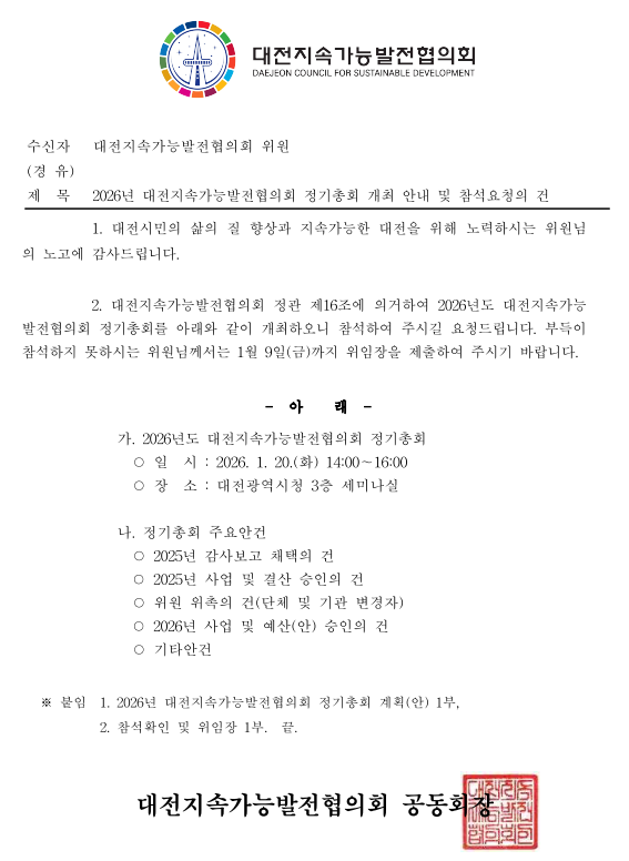 2026년 대전지속가능발전협의회 정기총회에 여러분을 정중히 초대합니다.